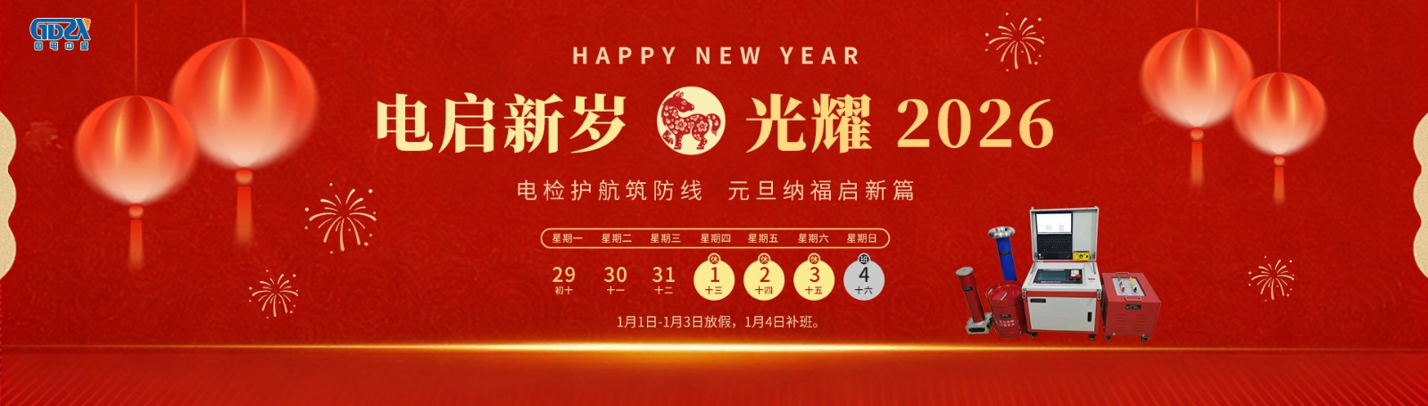 元旦鐘聲送吉祥,喜迎新年新氣象!根據(jù)國家節(jié)假日安排,結(jié)合公司實(shí)際情況,2026年元旦節(jié)放假安排如下:放假時間:2026年1月1日-1月3日放假,共3天。1月4日(星期日)正常上班。如有業(yè)務(wù)事宜請與相關(guān)業(yè)務(wù)人員聯(lián)系,相關(guān)聯(lián)系方式如下:1、產(chǎn)品和服務(wù)咨詢熱線:400-0828-027 / 132941535862、電氣試驗(yàn)技術(shù)咨詢熱線:186071457333、售后服務(wù)專線:027-65526006萬象更新迎元旦,愿您新年新起點(diǎn),事業(yè)順?biāo)欤T事皆圓!——【武漢國電中星...
